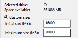 I’m trying to set page file to 16Gb-30Gb. So it some have some extra space..